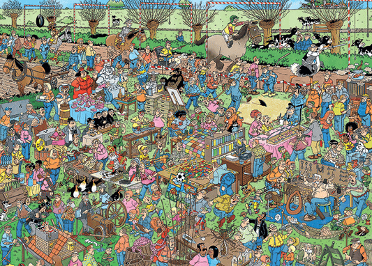 Jan van haasteren puzzels zijn puzzels met veel kleur en details. Jan van haasteren tekent al decennia lang humoristische platen die je steeds weer verrassen en laten lachen. De echte fans kennen de specifieke kenmerken van jan van haasteren en zoeken in elke puzzel direct naar de haaienvin, sinterklaas, de handjes, het kunstgebit en jan’s zelfportret.