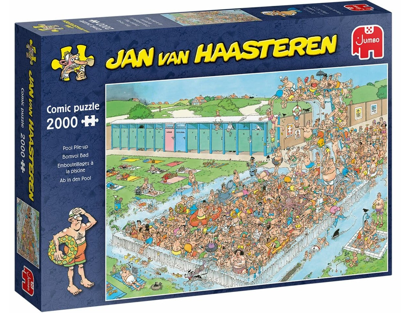 Het is een warme zomerdag en iedereen zoekt verkoeling en ontspanning in het buitenbad. Het zwembad is inmiddels bomvol! Kan jij alle bekende Jan van Haasteren familieleden nog terug vinden?
