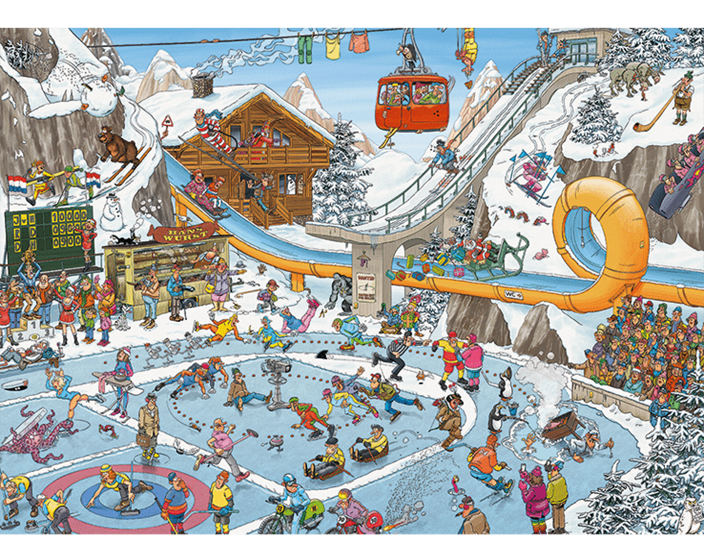 De Jan van Haasteren familie bezoekt de winterspelen. Alle Wintersporten komen aan bod.