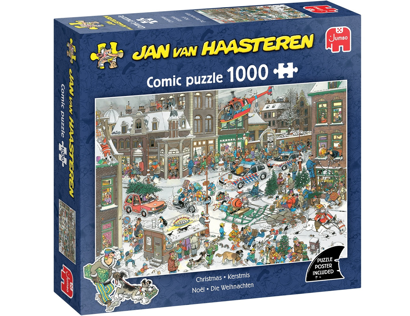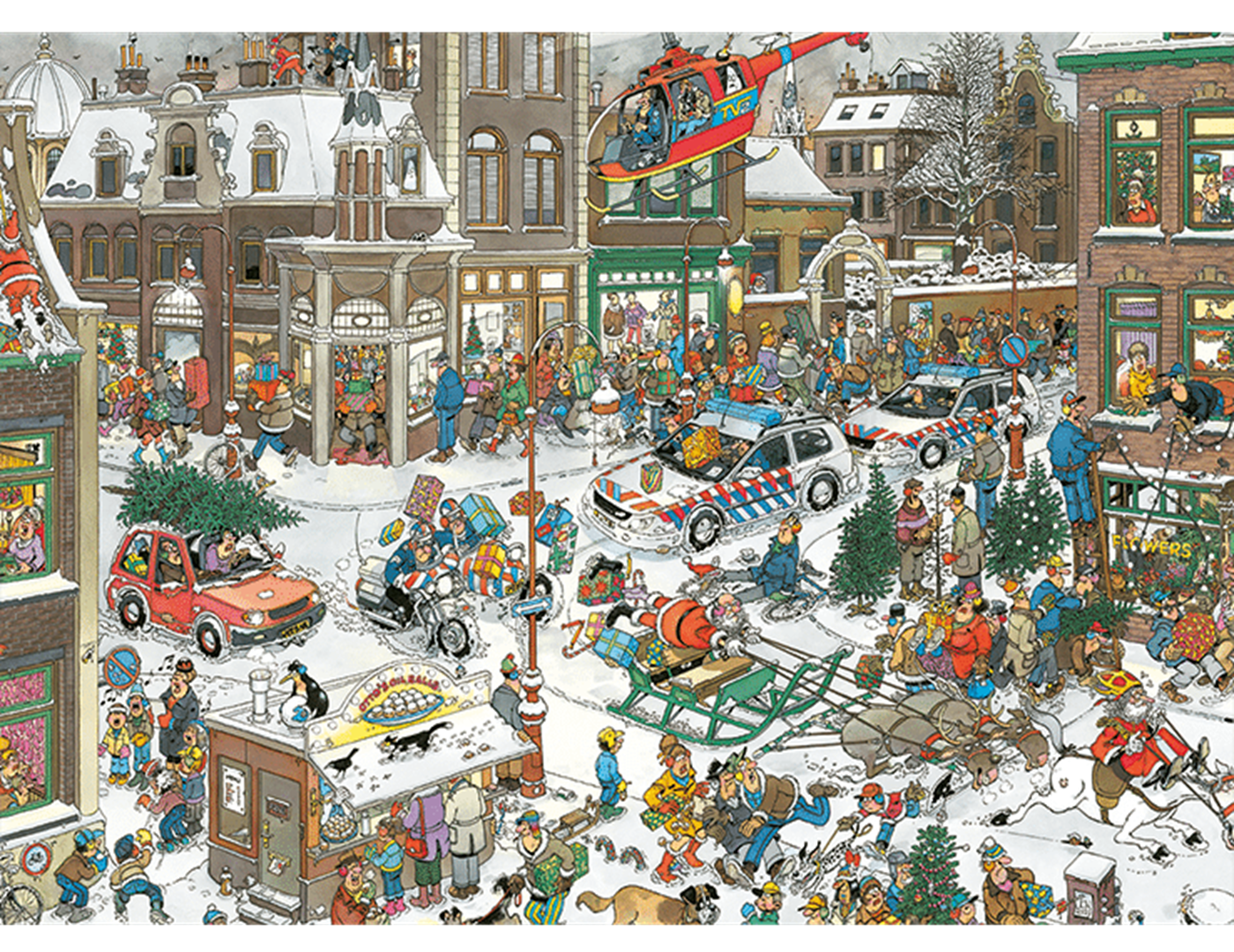 In deze Jan van Haasteren Kerstmis puzzel is het een drukte van jewelste, iedereen doet nog snel de laatste Kerstinkopen maar dat gaat niet zo soepel...