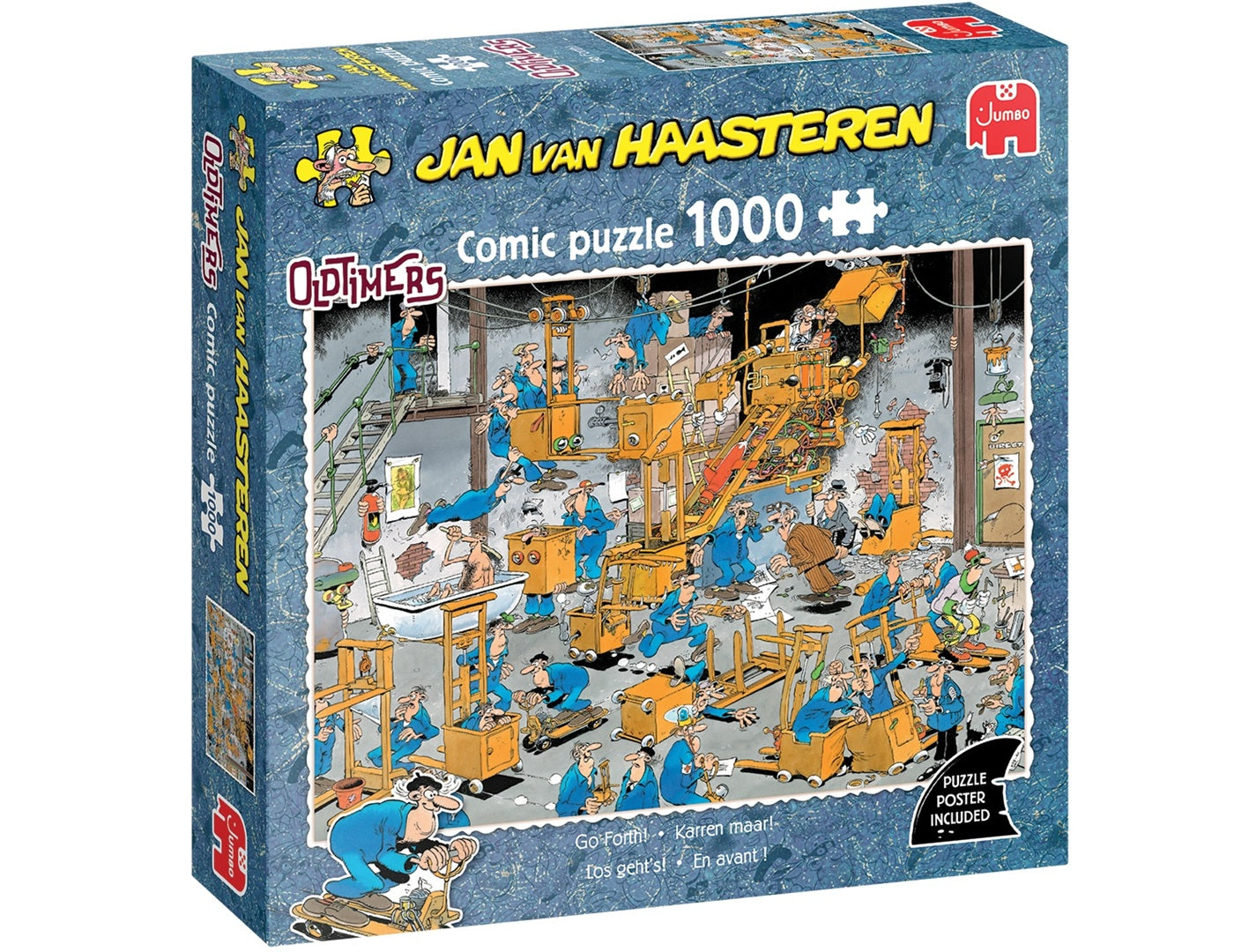 Met de Oldtimers blikken we terug op de beginperiode van de Jan van Haasteren legpuzzels. Een klein beetje nostalgie en vooral een ode aan het geweldige vakmanschap van Jan van Haasteren. In de plaat “Karren maar!” loopt de productie van vorkheftrucks volledig uit de hand…..