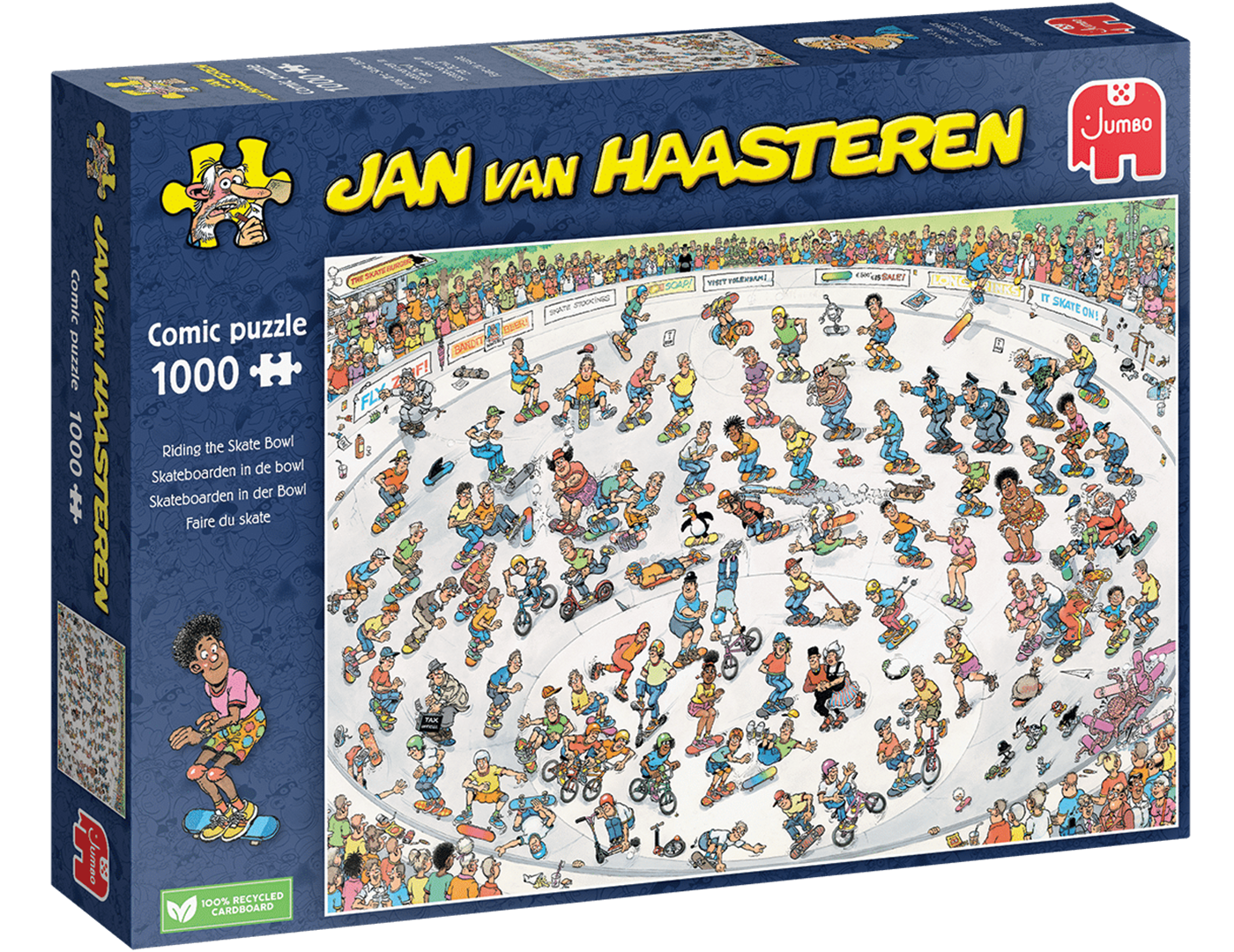 Wat een actie in deze skatebowl! Echt iedereen van de familie Jan van Haasteren voert trucs en manoeuvres uit. Schoonmoeder gaat met hoge snelheid door de bowl en Jan lijkt ook zijn plek te hebben gevonden in deze chaos van skateboarders, BMX-rijders en andere atleten.