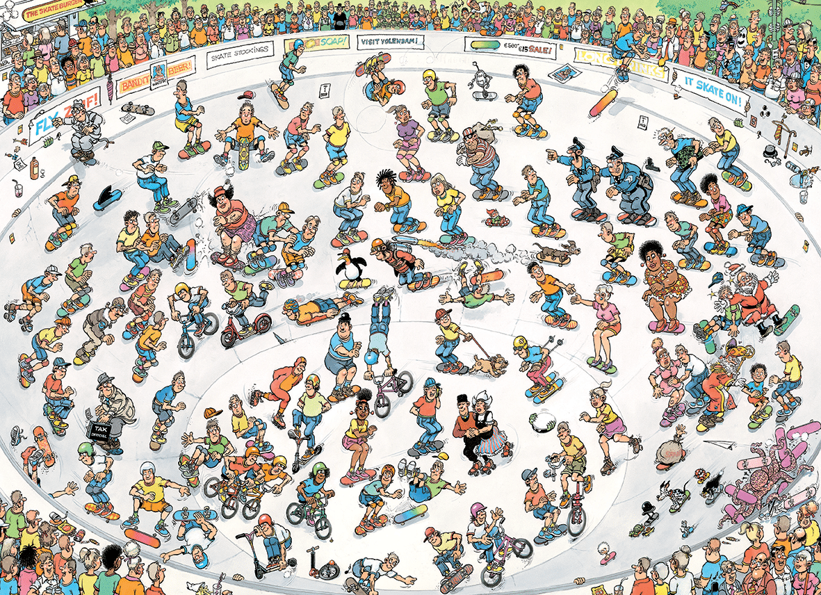Wat een actie in deze skatebowl! Echt iedereen van de familie Jan van Haasteren voert trucs en manoeuvres uit. Schoonmoeder gaat met hoge snelheid door de bowl en Jan lijkt ook zijn plek te hebben gevonden in deze chaos van skateboarders, BMX-rijders en andere atleten.