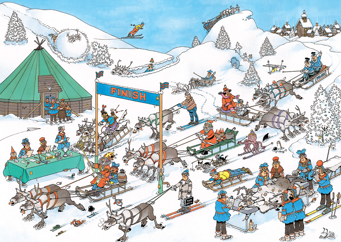 De Rendierraces zijn in volle gang en de deelnemers hebben bijna de finish bereikt. De familie Jan van Haasteren doet mee en iedereen heeft zijn eigen strategie om het goud te winnen. Is het echter, met al zijn jarenlange ervaring, eerlijk om de Kerstman mee te laten doen aan de race?