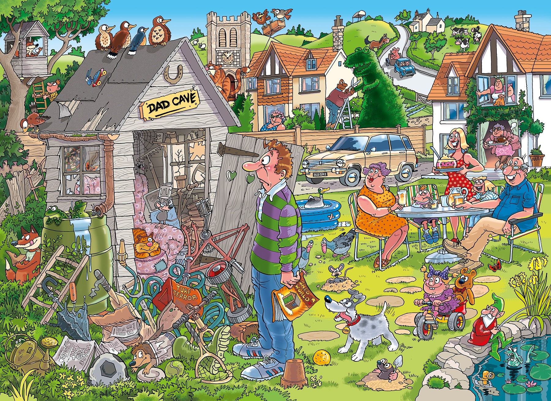 De dagen van het oude tuinhuisje zijn geteld. Papa’s kleine toevluchtsoord is zo rommelig dat hij er al jaren niet meer in heeft gezeten. Het is niet langer een plek om aan de drukte te ontsnappen, maar is gewoon een stortplaats geworden. Het is tijd voor een upgrade, maar hoe zal de nieuwe ‘Mancave’ eruitzien? Zal er nog steeds ruimte zijn voor fietsen, knuppels en ballen, of zullen de hobby’s van papa voorrang krijgen? Dit is het tafereel dat je zult moeten puzzelen.
